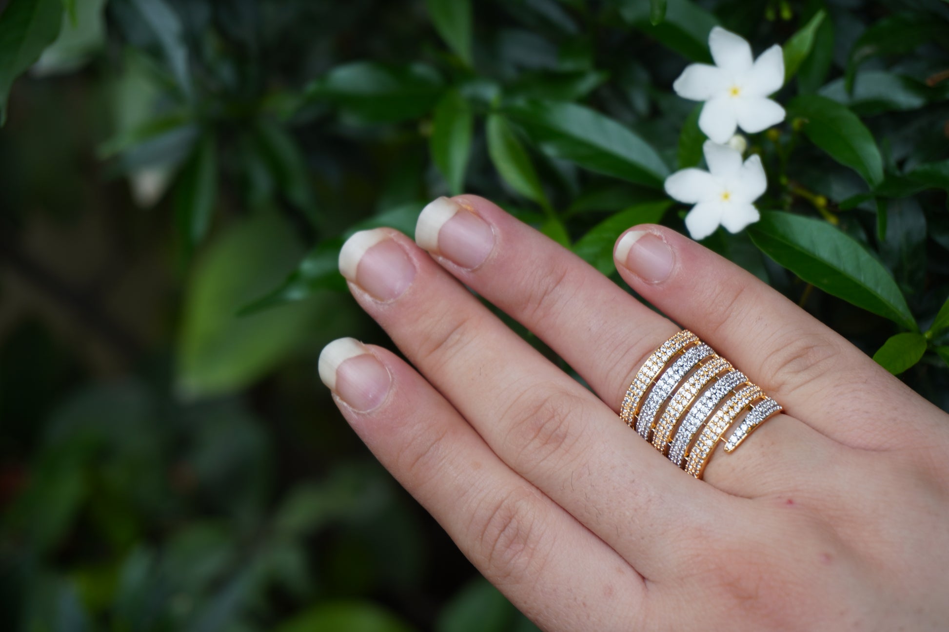 The Adjustable American Diamond Ring AJ 104 is expertly crafted to deliver both elegance and adaptability. Its adjustable band ensures a perfect fit, while the meticulously set American diamonds provide exceptional brilliance. This ring is designed to complement a variety of styles, making it a sophisticated choice for daily wear or special events. Experience refined luxury with a piece that balances comfort and timeless beauty.