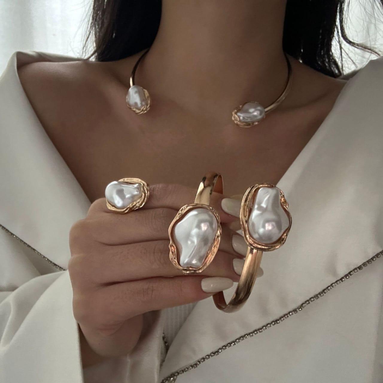 Baroque Pearl Necklace + Bracelet + Ring Gold Combo