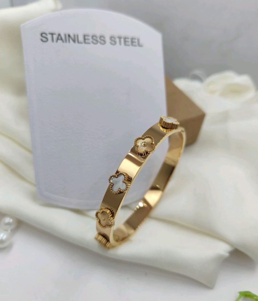 Elevate your accessory game with our stunning White Clover Bracelet. Crafted from high-quality stainless steel, this elegant gold bracelet features four delicate white clover flowers that add a touch of whimsical charm to any outfit. The intricate detailing and fine craftsmanship make this piece a must-have for any jewelry collection. Whether you're dressing up for a special occasion or simply adding a touch of sophistication to your everyday look, this bracelet is sure to make a statement. Treat yourself or surprise a loved one with this timeless and versatile piece that will never go out of style.